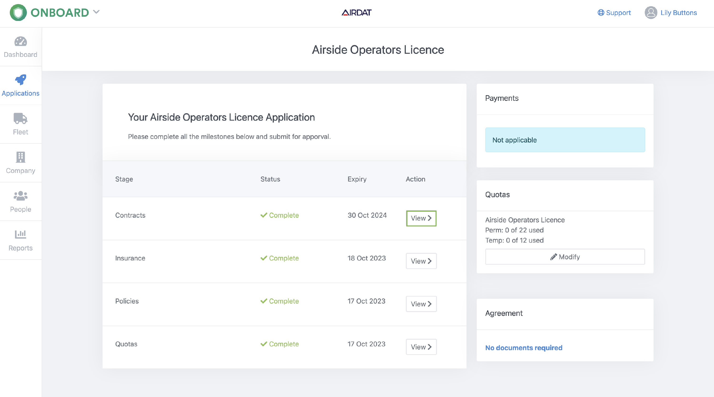 The Airport Application is a set of criteria in which an airport will check before approving your operation at their airport. Please Note: where AIRDAT is used for vehicle permitting, the airport application must be completed prior to submitting any vehicle permit applications.